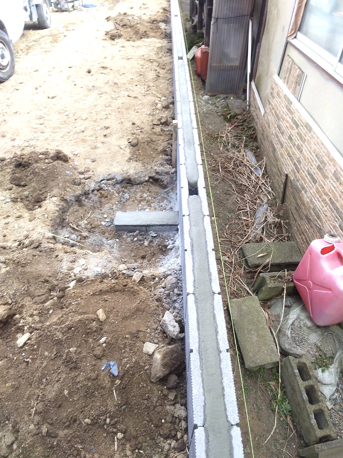 週末はまた寒波が来るとの予報なので急遽今日は先般積み上がっていたブロックの天端モルタル仕上げと同時に控え壁がGLより上に飛び出しているので一本を外してGL下にしました。